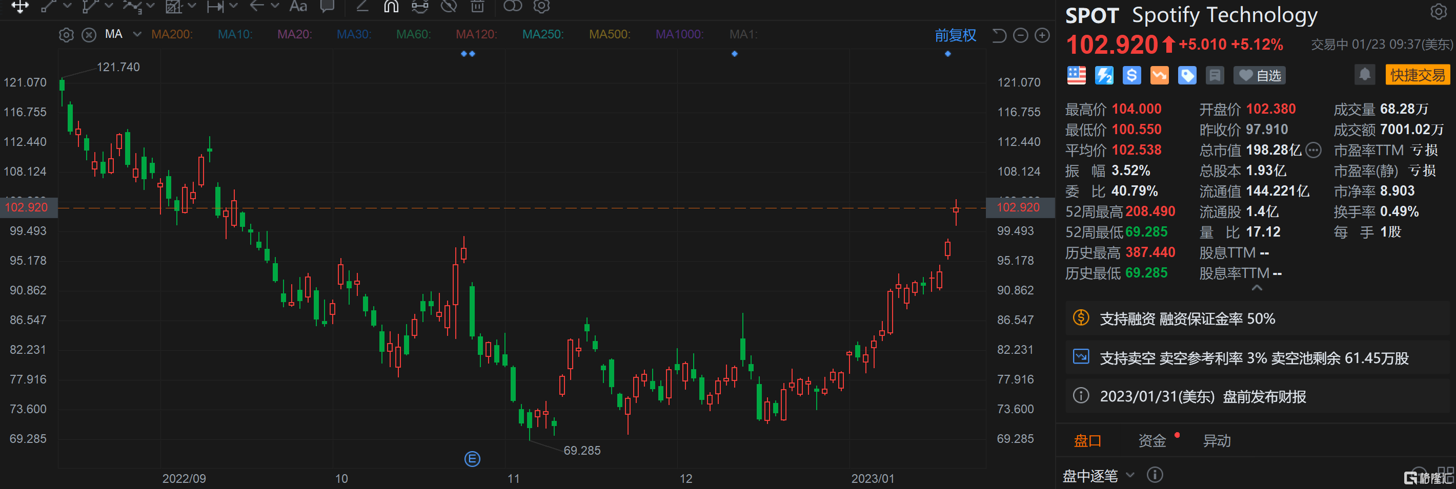 格隆汇1月23日丨Spotify(SPOT.US)涨超5%,报102.92美元。据报道,Spotify将裁员6%,估计重组将产生约3500-4500万欧元的遣散费用。